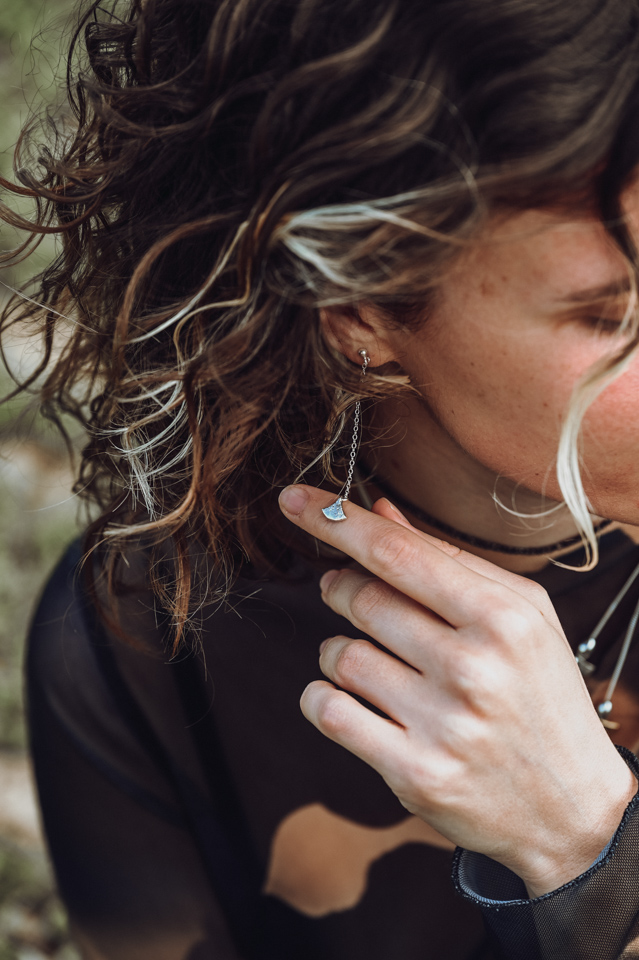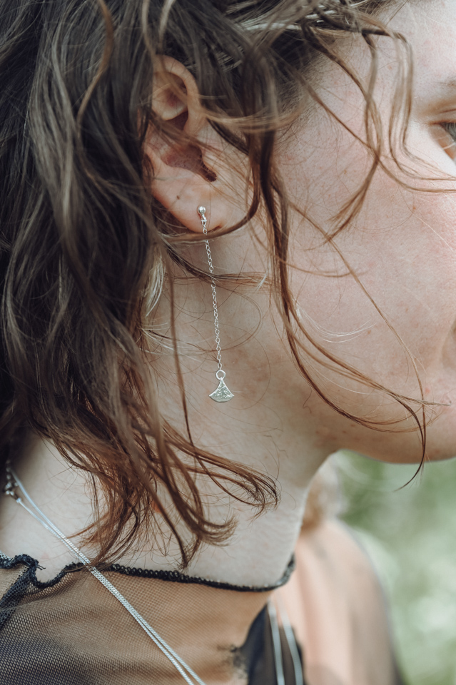 Τα σκουλαρίκια είναι κατασκευασμένα από ορείχαλκο με ασημένια καρφάκια και αλυσίδα ή ασήμι.