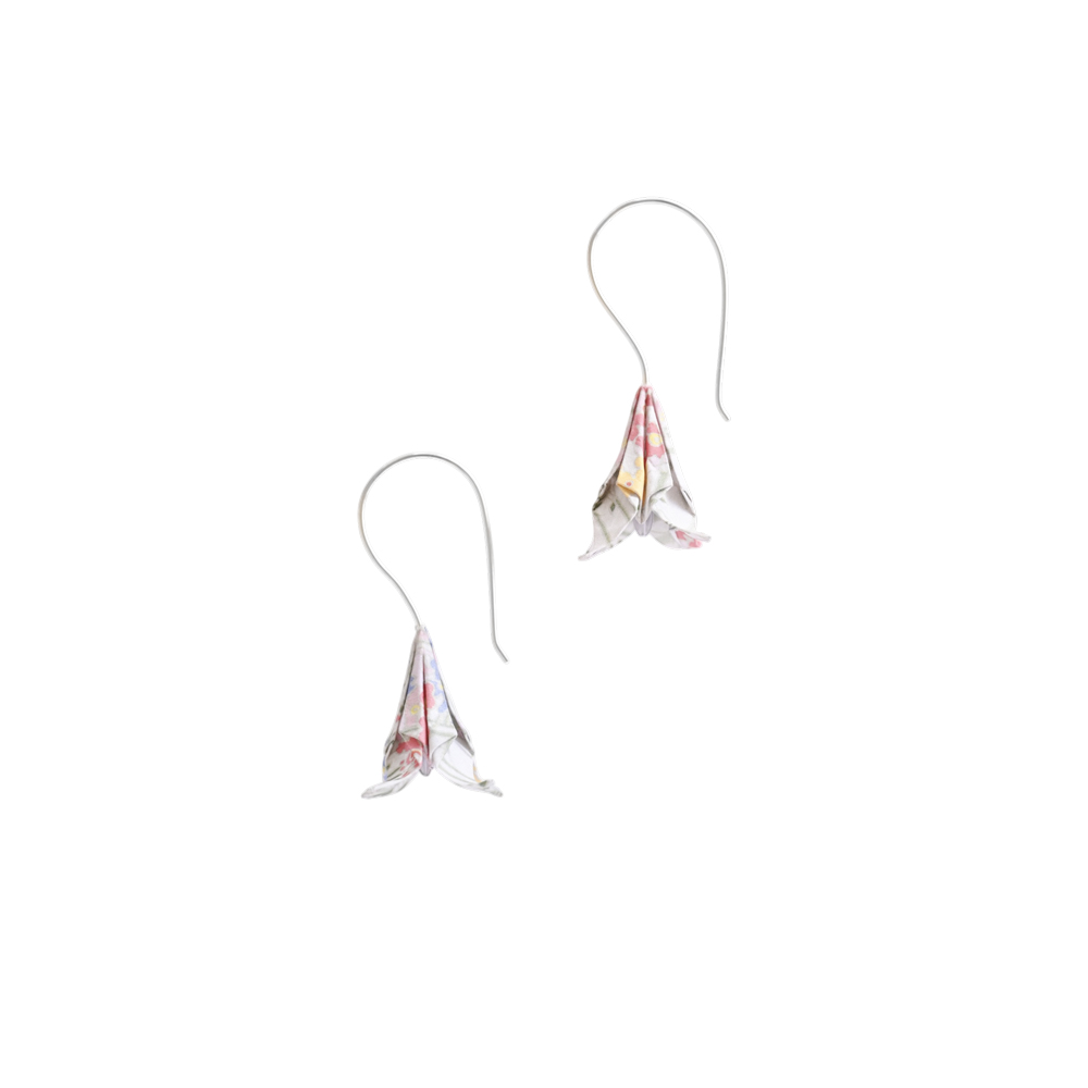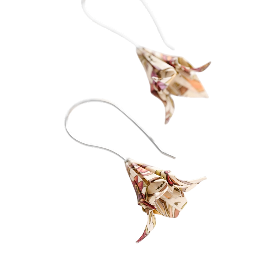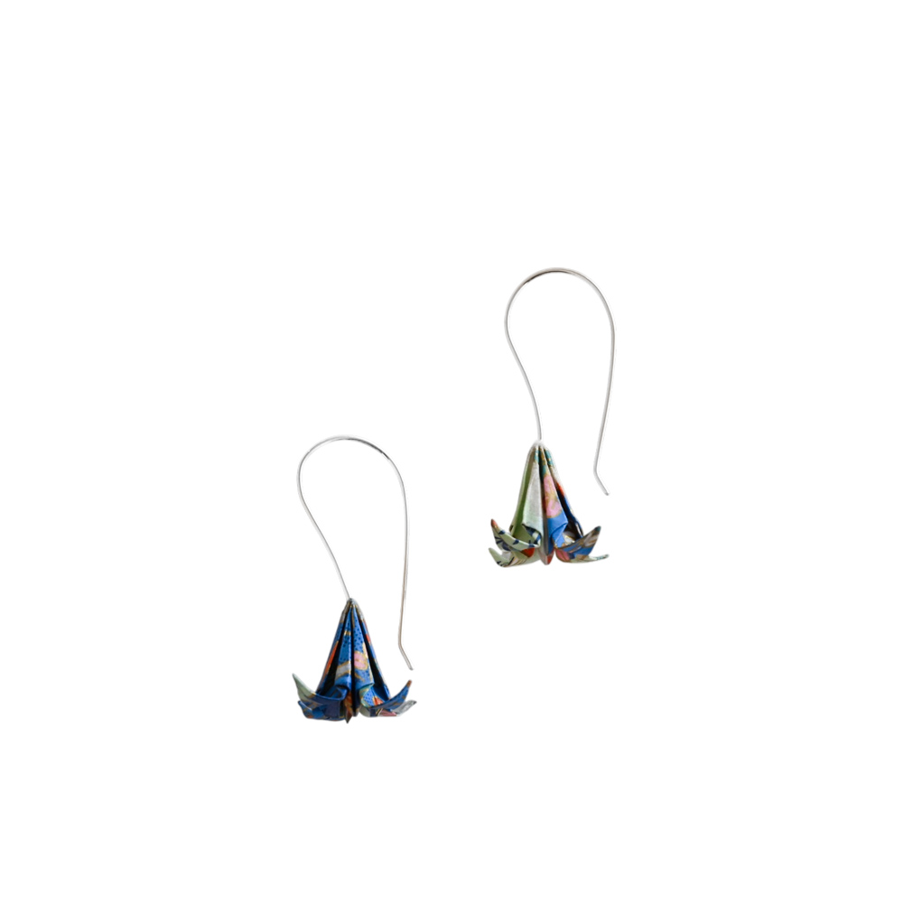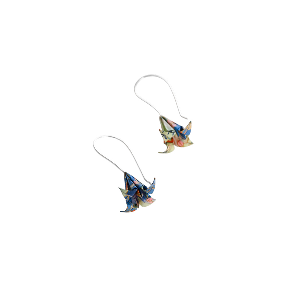 Τα σκουλαρίκια ίριδες origami είναι κατασκευασμένα από ιαπωνικό χαρτί origami και ασημένια γαντζάκια.