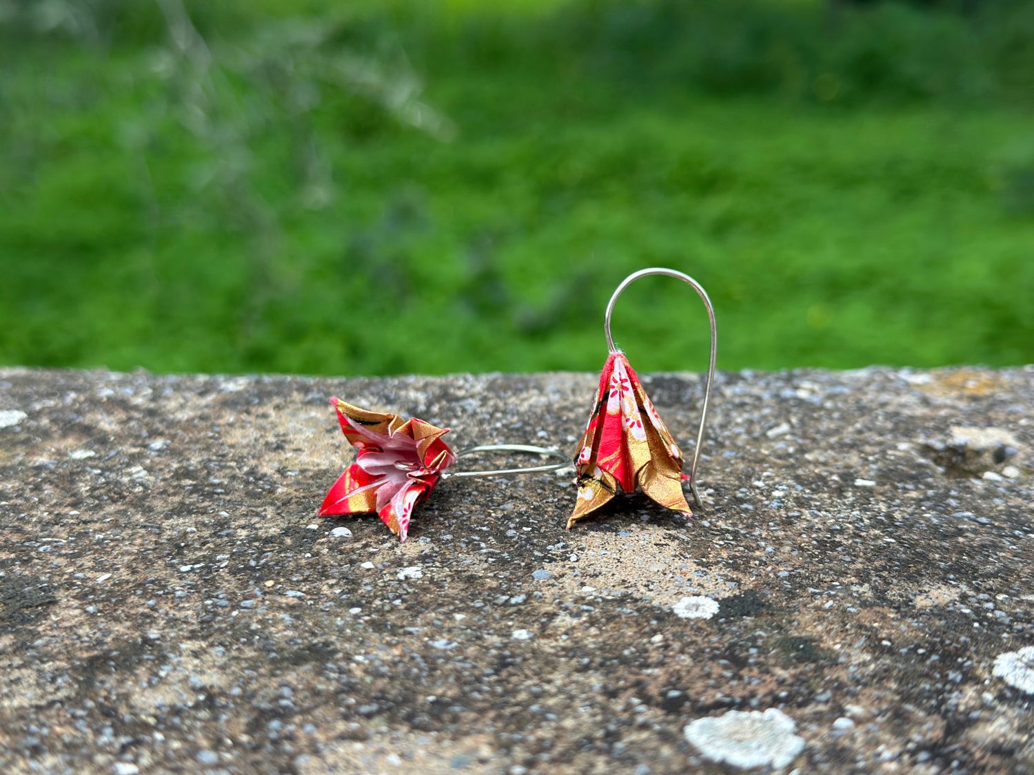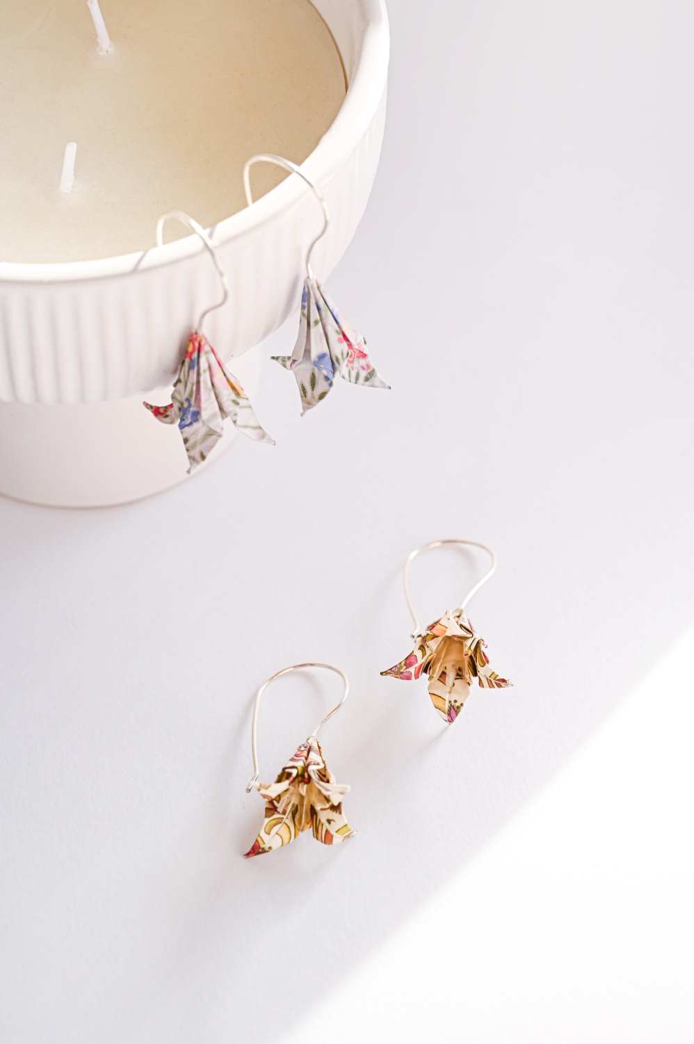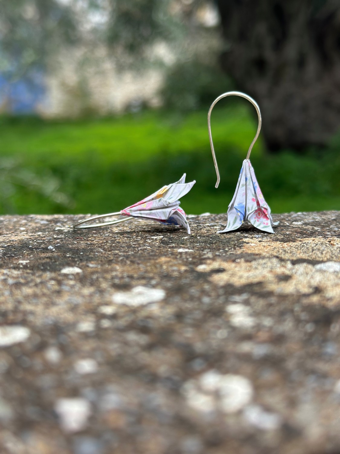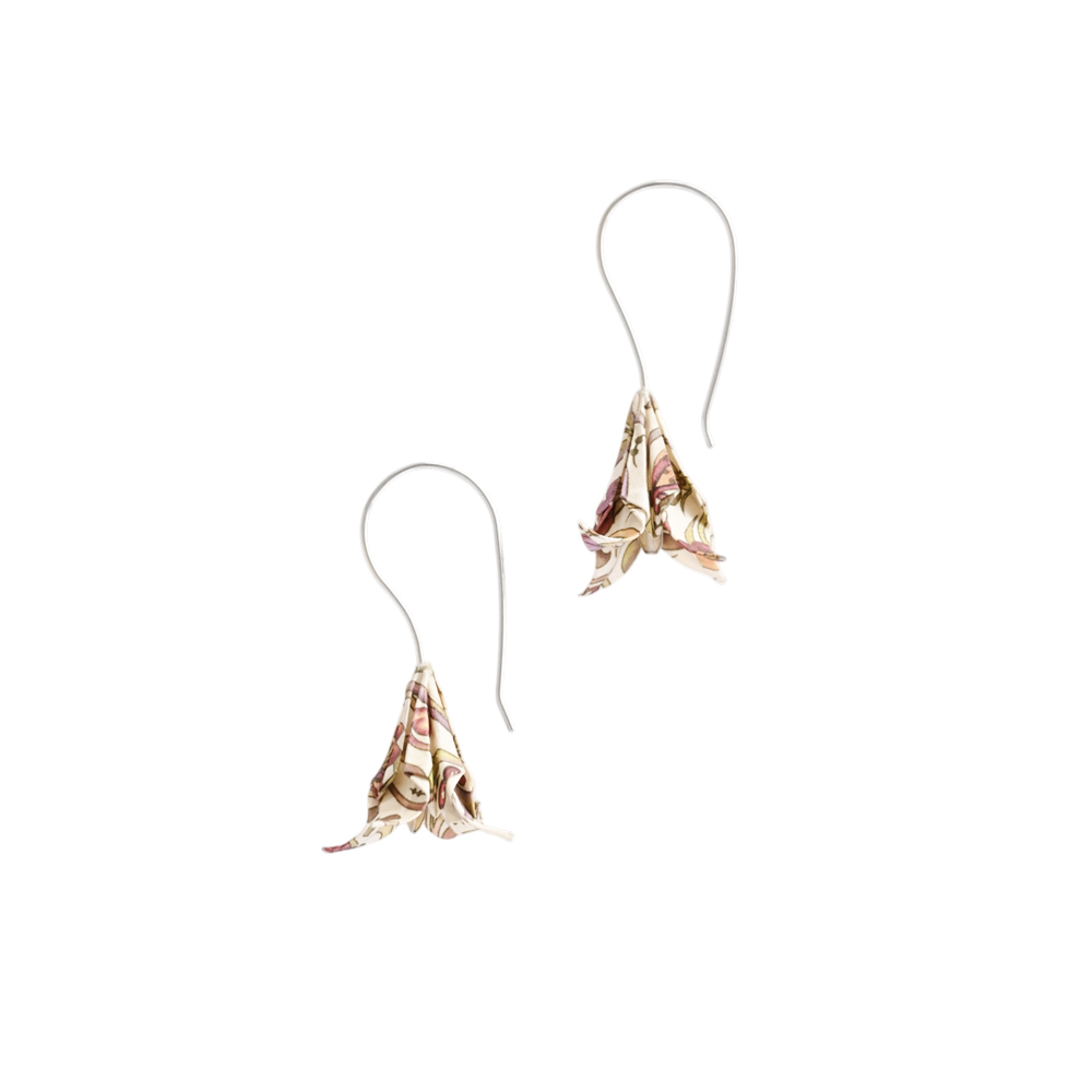 Τα σκουλαρίκια ίριδες origami είναι κατασκευασμένα από ιαπωνικό χαρτί origami και ασημένια γαντζάκια.