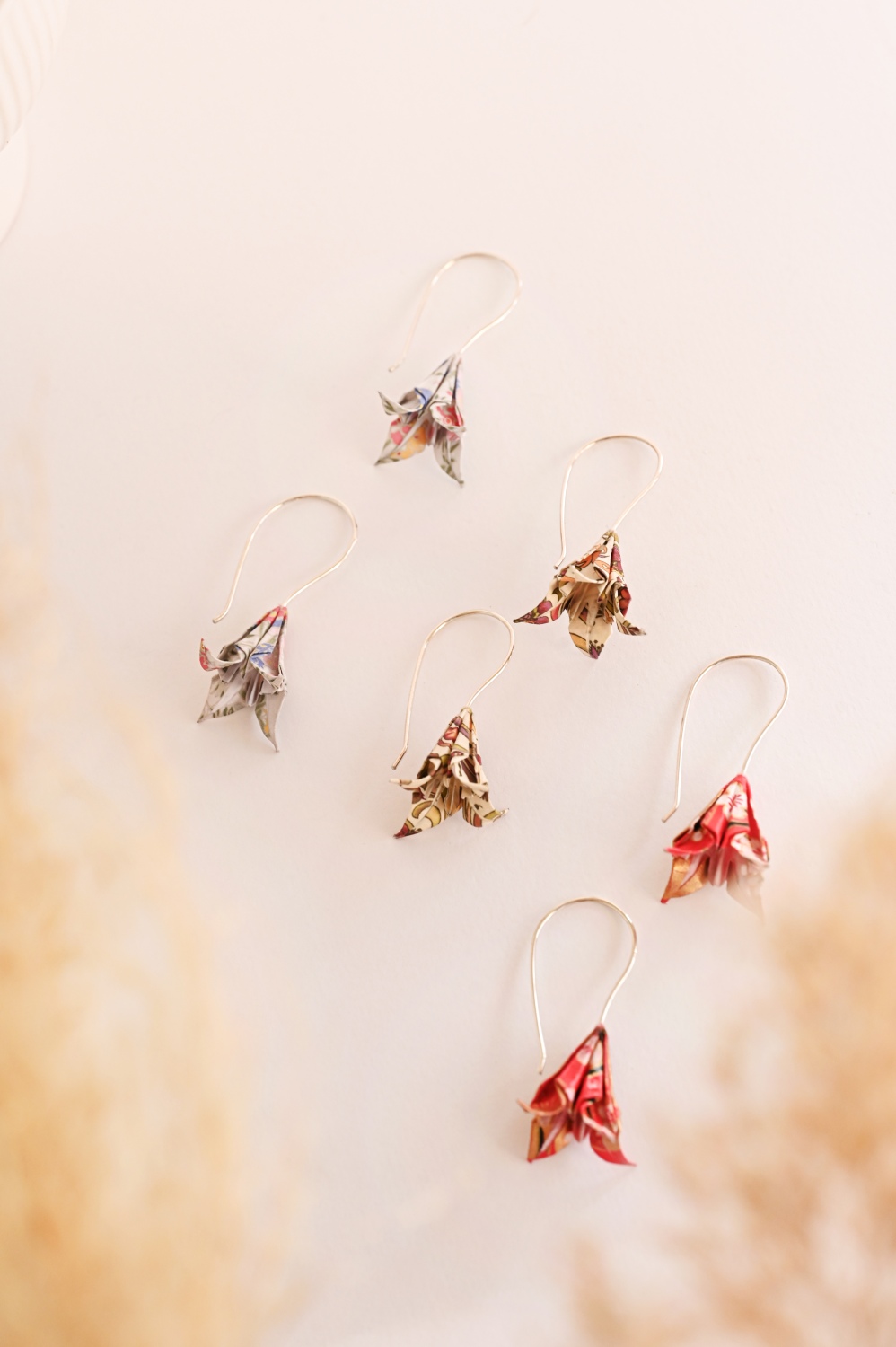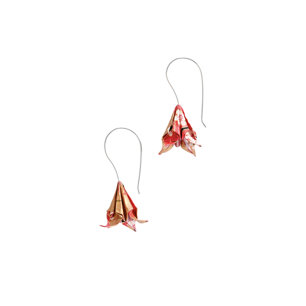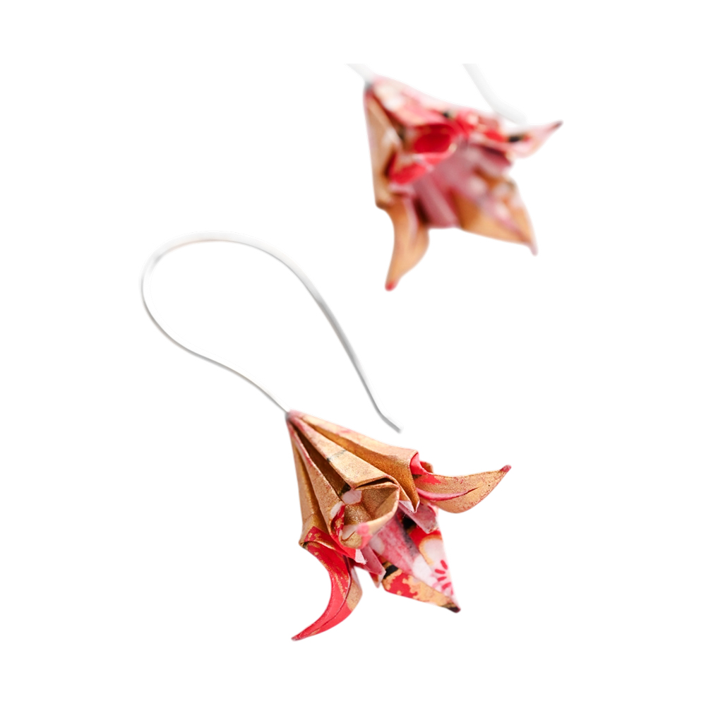 Κάθε σκουλαρίκι είναι κατασκευασμένο από ένα τετράγωνο κομμάτι χαρτιού διπλωμένο και επικαλυμμένο με ένα ακρυλικό γυαλιστερό υλικό για πρόσθετη αντοχή και αδιαβροχοποίηση.