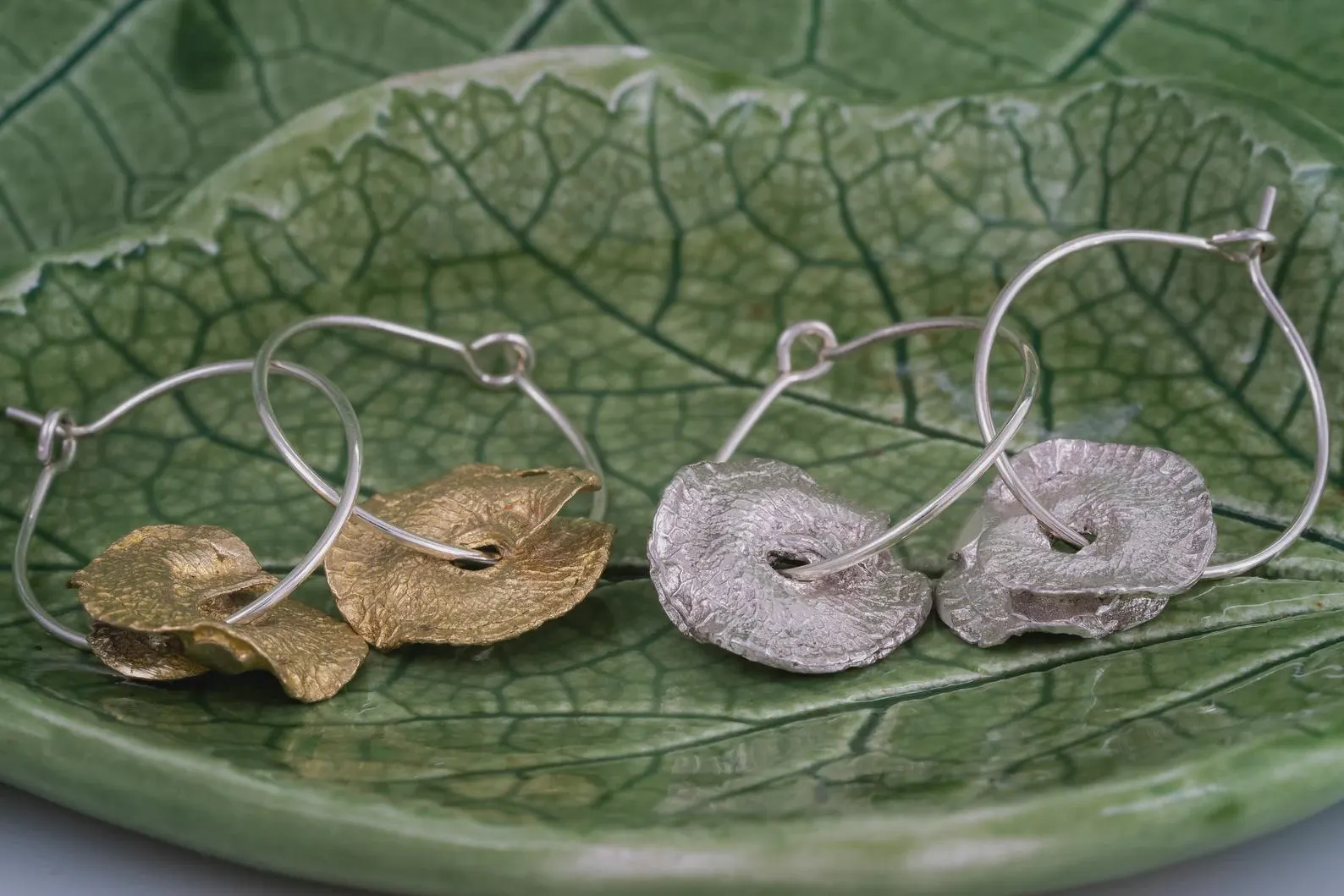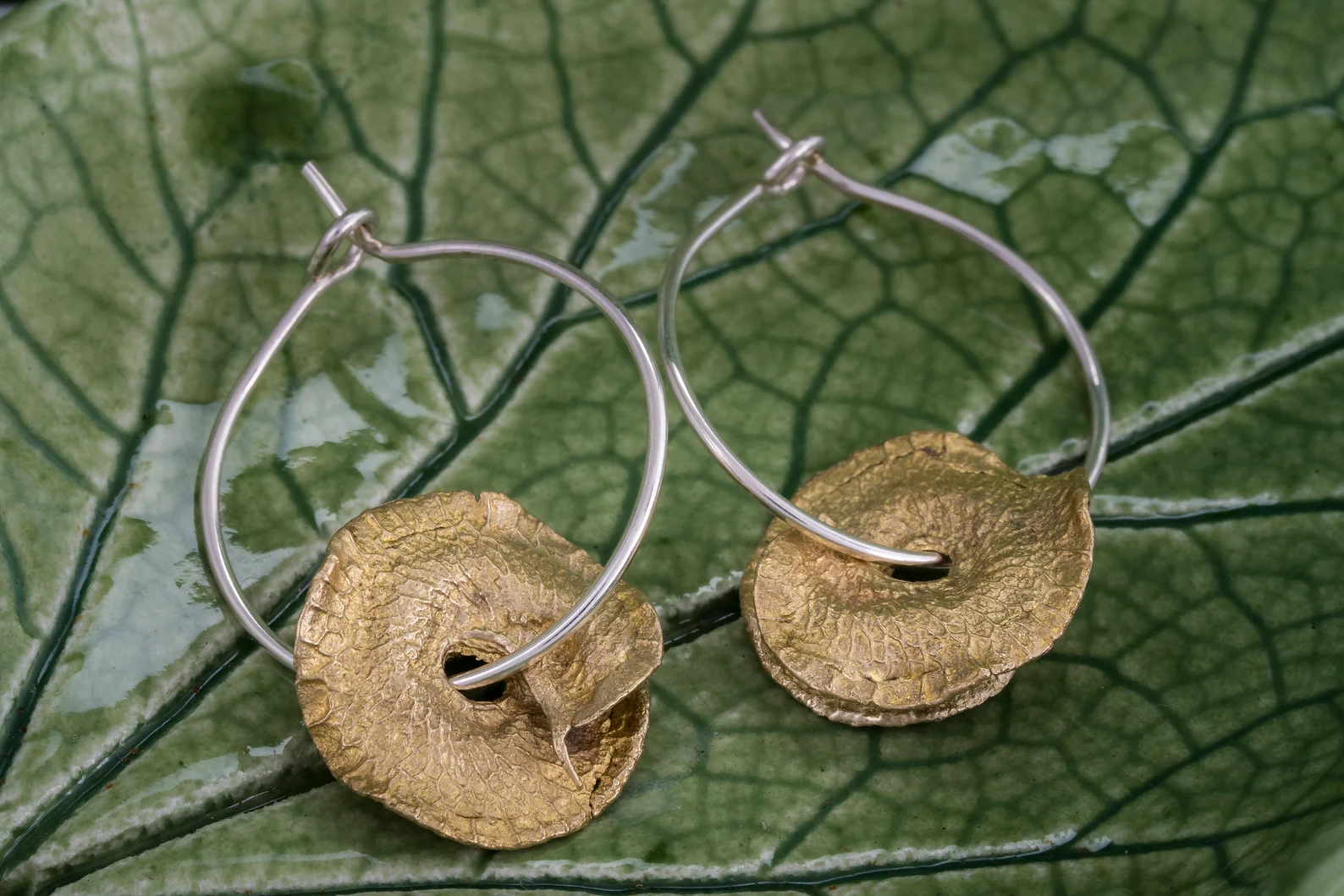 «Alfalfa» hoop earrings are constructed by bronze with sterling silver hoops or sterling silver.
