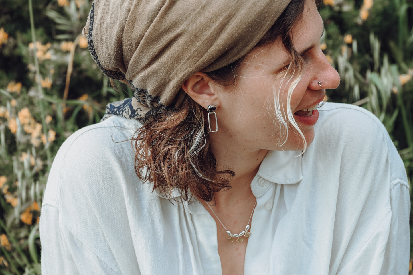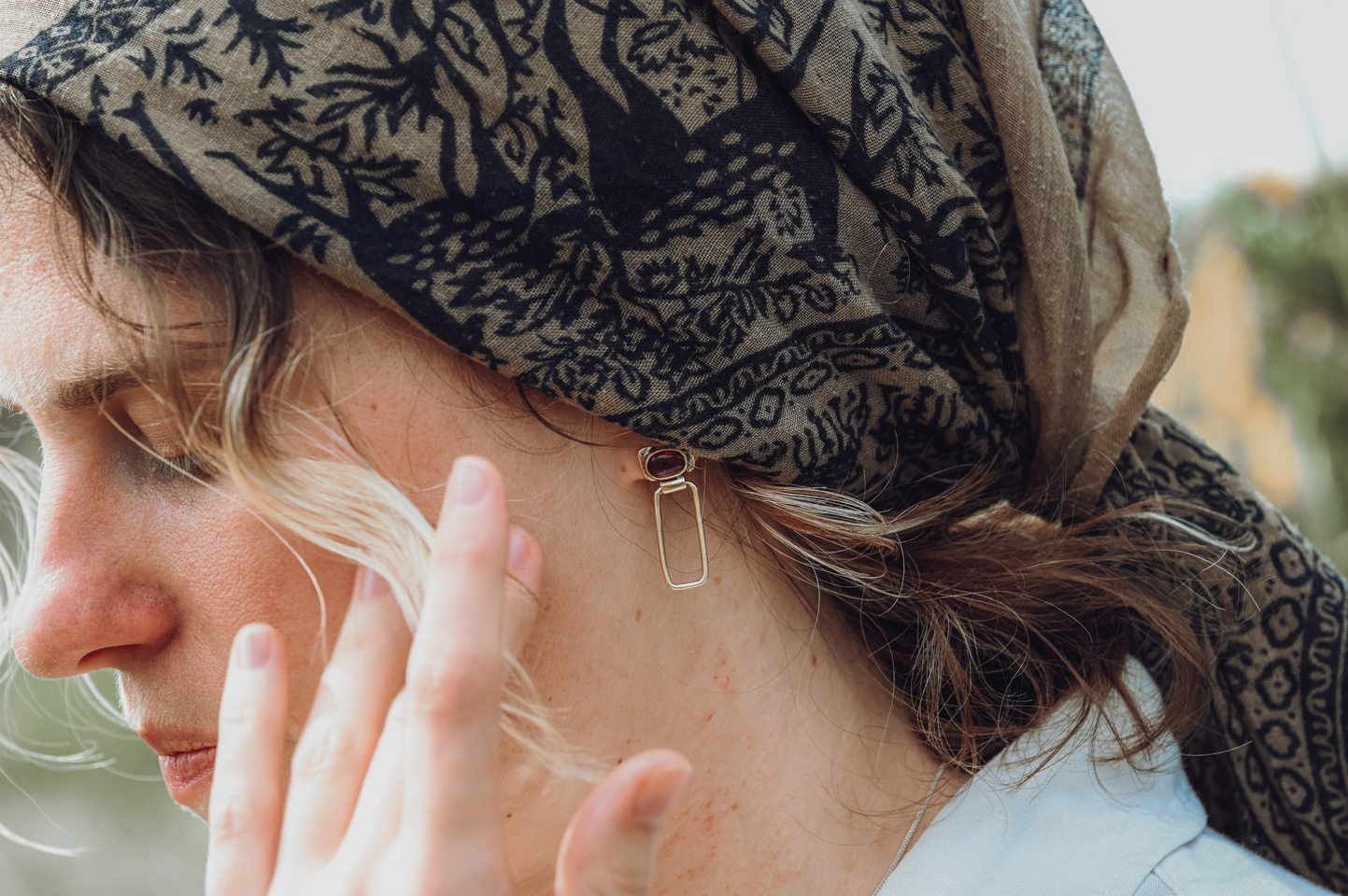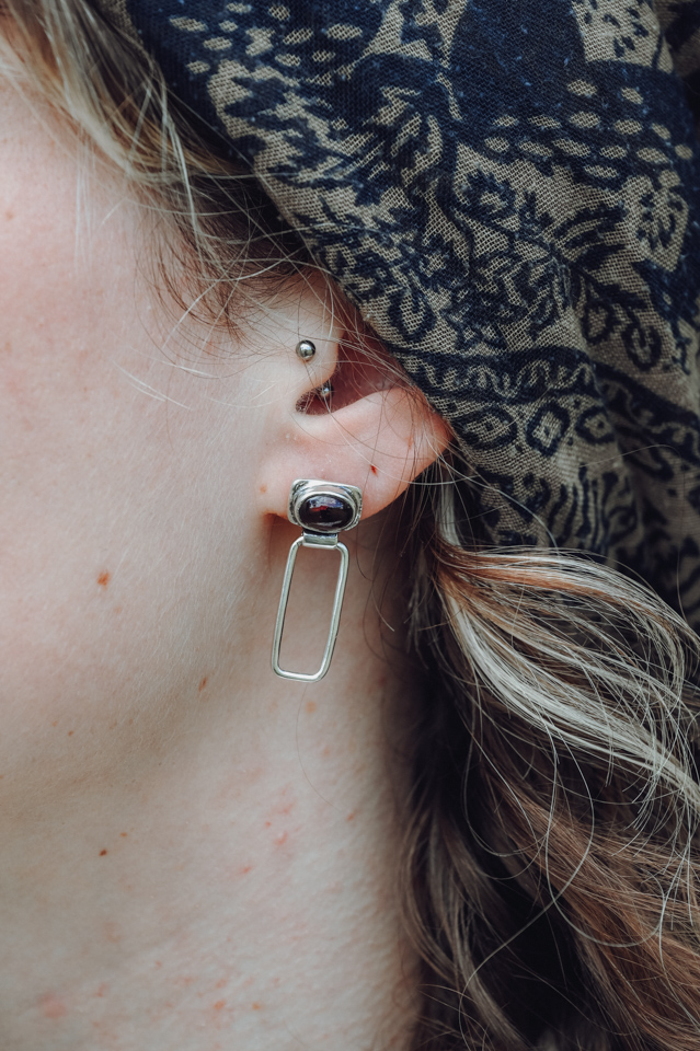 «Alkyoni» earrings are constructed by bronze with silver pins or sterling silver and 6x8mm garnet oval shaped gemstones