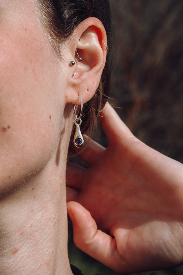 These earrings are constructed by bronze with silver hoops or sterling silver and purple 4mm cubic zirconia round shaped crystals.