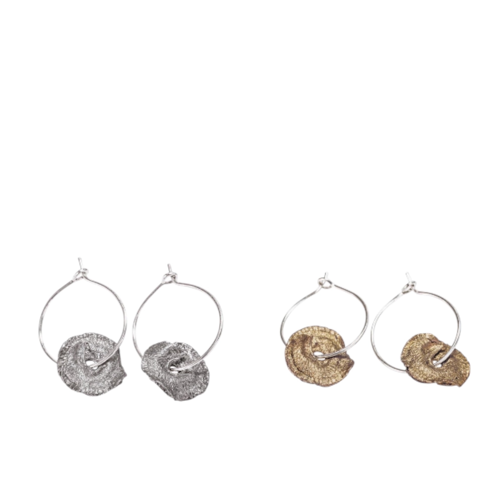 «Myrti» hammered triangle hoops are constructed by bronze with silver hangers or sterling silver.